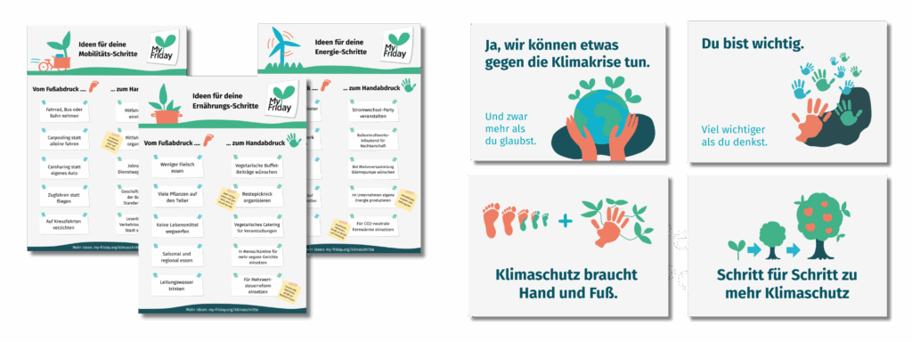 Wenn du möchtest, kannst du auch My Friday du direkt in deine Veranstaltung einbinden. Genau für solche Veranstaltungen haben wir nämlich Poster entwickelt, die Ideen und Impulse geben, wie man vom eigenen Fußabdruck hin zum Handabdruck aktiv werden kann. Dazu passend gibt es Postkarten zum Notieren der nächsten drei Klimaschritte, die man angehen möchte.